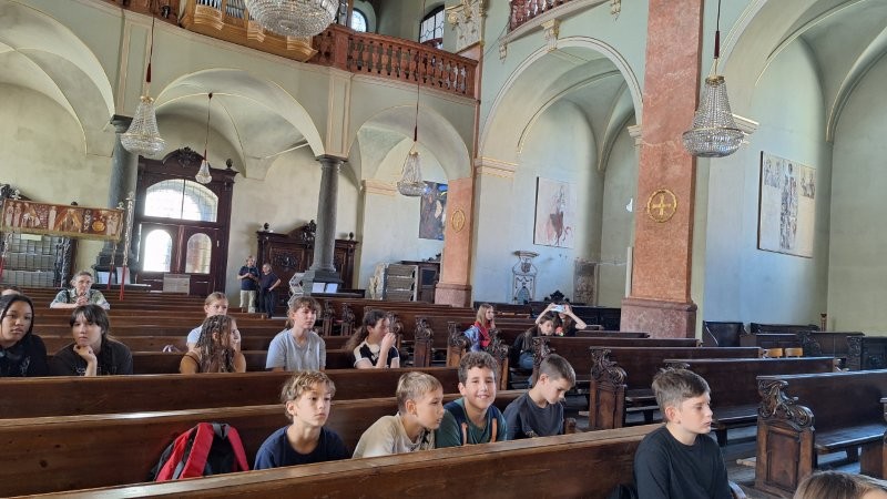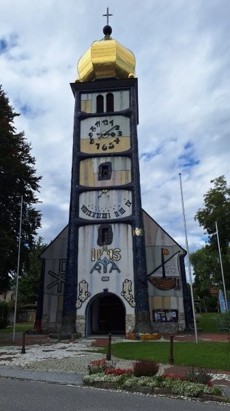 Az odafelé vezető úton gyönyörű szép tájakat láttunk, sőt megálltunk Bärnbach-ban is megnézni a Szent Barbara templomot. Ez az épület nem hétköznapi, más, mint a piliscsabaiak. Színes, modern a külső megjelenése, például a boltozat és a torony aranyozott, arany gömbök és színes csempék, kerámiák díszítik, de a belső tér kevésbé modern, jobban hasonlít egy hagyományos templomhoz. Az udvaron 12 kapu jelképezi a világ vallásait, amelyek szintén szép színesek, jelképeket ábrázolnak.