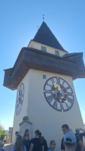 Felsétáltunk Graz belvárosába és a várba, ahol van egy óratorony, az Uhrturm. Alatta egy alagútrendszer fut, amiben kialakítottak egy csúszdát. Kaptunk egy ülőpárnát, belekapaszkodtunk a kapaszkodóba és egyesével, ki-ki a saját bátorsága szerinti lendülettel, lecsúszott a 175 méter hosszú és 64 méter magas csúszdán a belvárosba. Ez egy csőcsúszda, ami belül sötét volt, és visszhangzott, főleg a lányok és a kísérő tanárnő sikításától. Rendkívül gyorsan siklottunk, körülbelül 40 másodperc alatt értünk a végére. Leérkezést követően monitoron lehetett látni egy képet magunkról a kiérkezés pillanatában, illetve az adatot, hogy hány kilométer per órával száguldottunk lefelé a csúszdán. Én 64 km/órával. Majd visszasétáltunk a buszhoz és folytattuk az utunkat hazafelé.